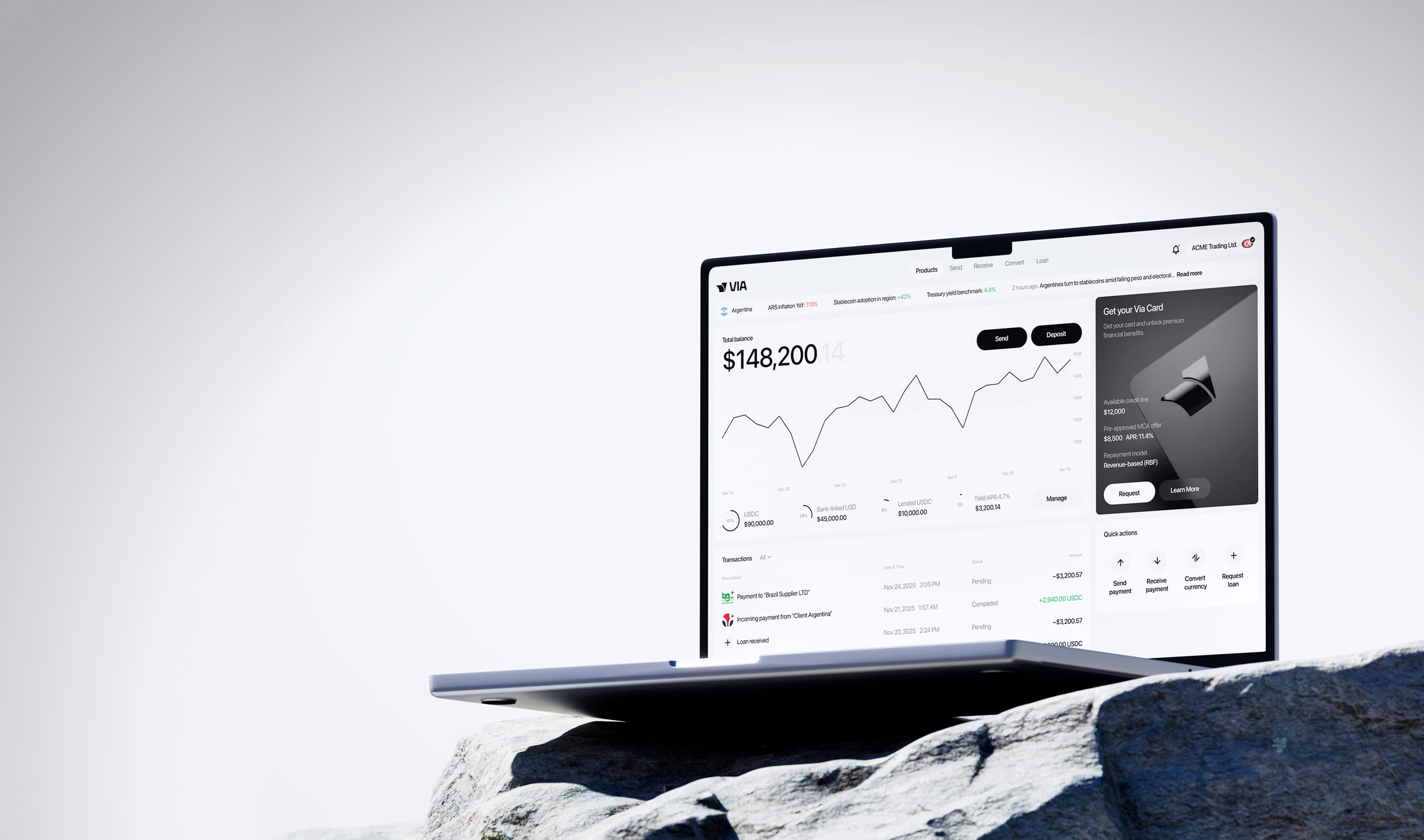 Via's stablecoin-first financing replaces outdated financial infrastructure with a modern system that utilizes blockchain rails and stablecoins for fast, cost-efficient payments, business credit, and treasury growth anywhere in the world, at the speed today's global companies require.